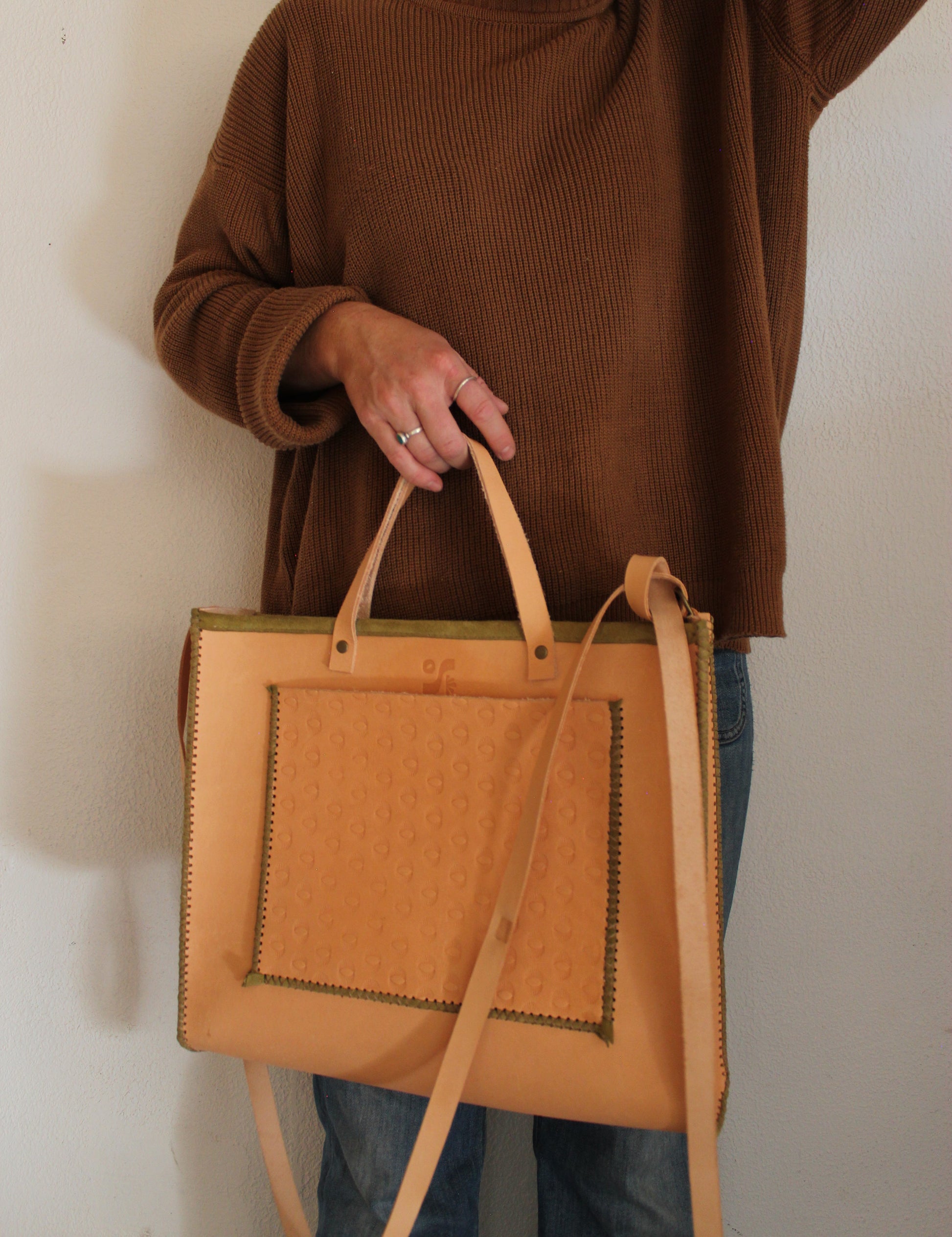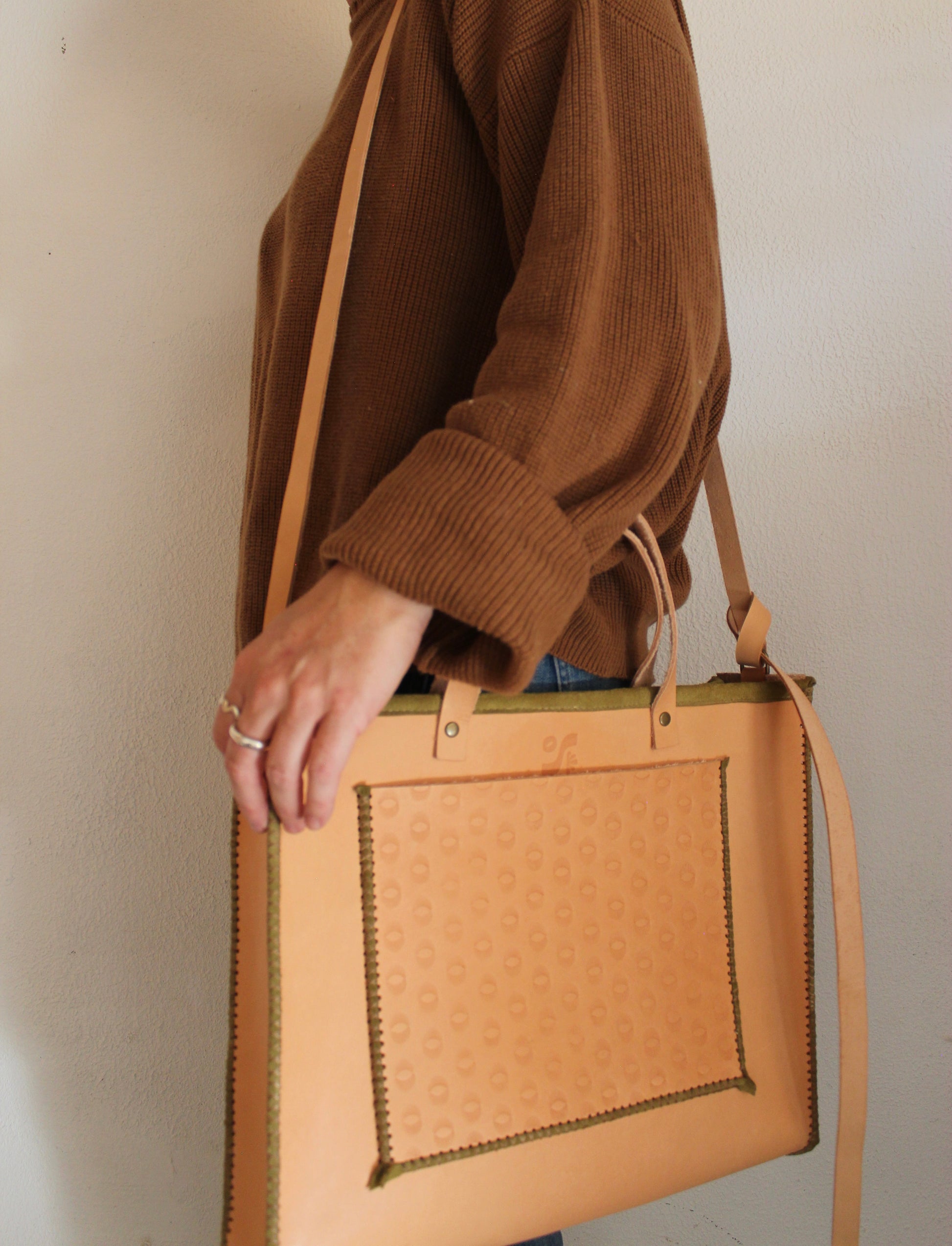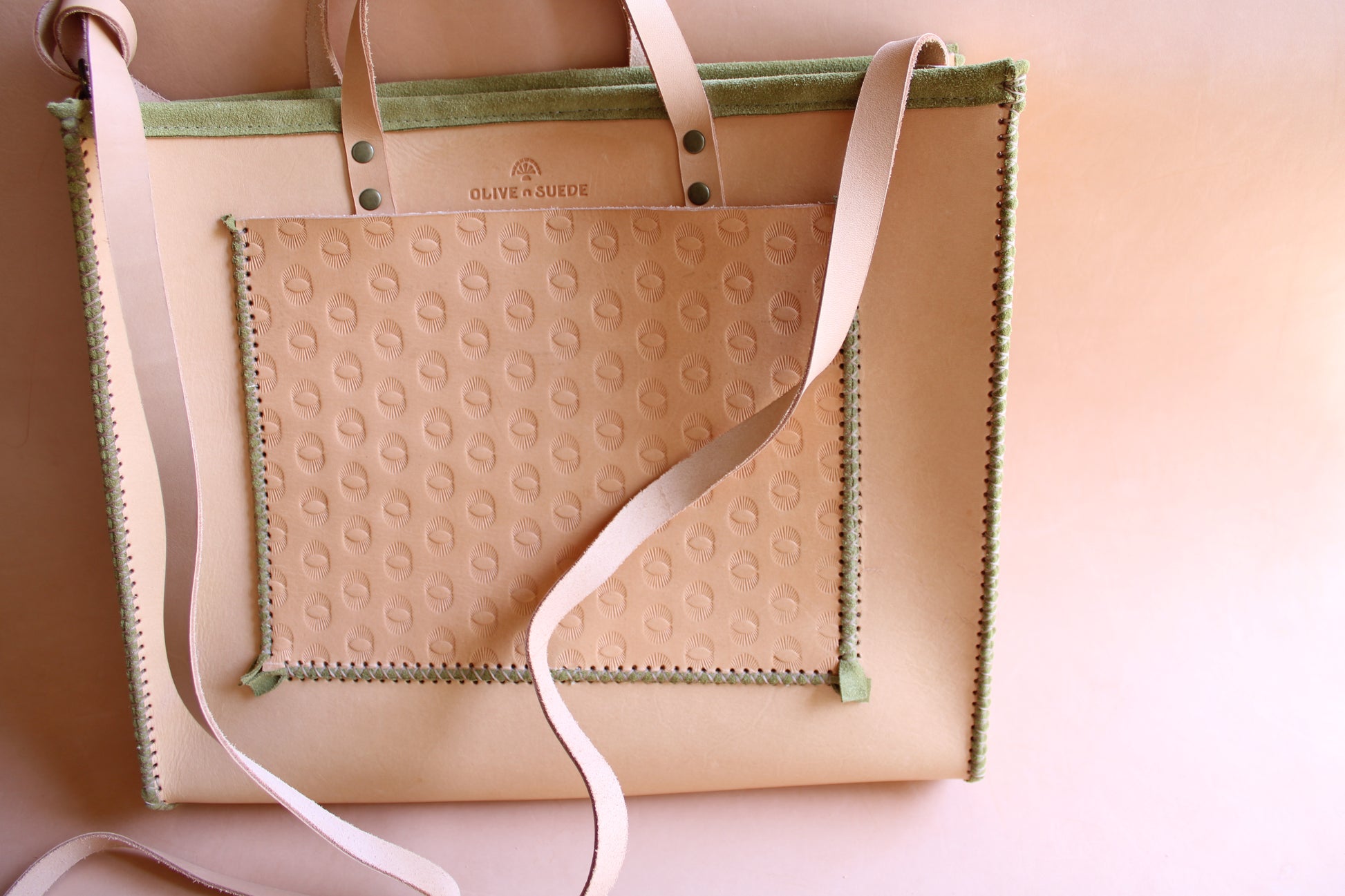 The Morocco Tote was made by combining colorful suede lining, hand stamped patterns and leather tanned by the sun. Its larger in size with an exterior pocket, handles and long adjustable strap. The sides and pocket are hand stitched with a braided polyester thread that is super durable. With the nature of the Veg tan leather it will darken with wear, giving it a special touch.