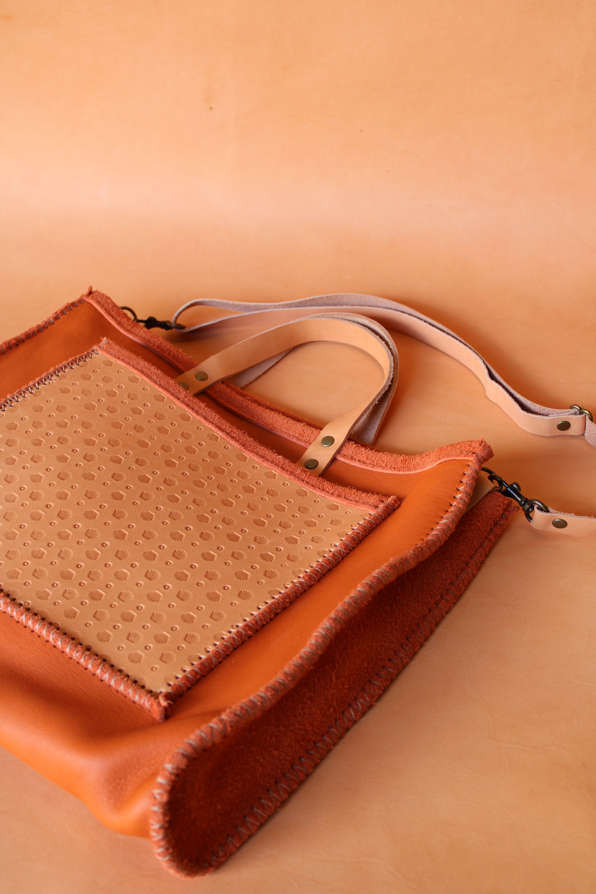 This tote is handmade with a full grain, bright orange colored leather out of the USA. The hides are nourished with a blend of grease, fats & oils to give the leather a soft, yet durable, well rounded feel. The tote has a smooth suede interior and a sun tanned leather pocket . The pocket is hand stamped with a shell like pattern Las Palmas or a sun ray pattern Morocco. Its larger in size with handles and long adjustable strap. The sides and pocket are hand stitched with a braided polyester thread that is super durable.